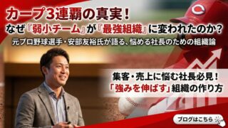 優秀なスタッフを育てたい 強い組織は全員を平均にしない!カープ3連覇から学んだ強み特化の組織論 弱いチームは全員同じ練習 強いチームはそれぞれの強みを徹底的に磨く 3連覇を支えたのは気合ではなく適材適所の設計だった これは教育にもビジネスにもそのまま通じる話 あなたの会社は平均点を目指していないか それとも突き抜けた強みを育てているか... 2026.02.28 優秀なスタッフを育てたい